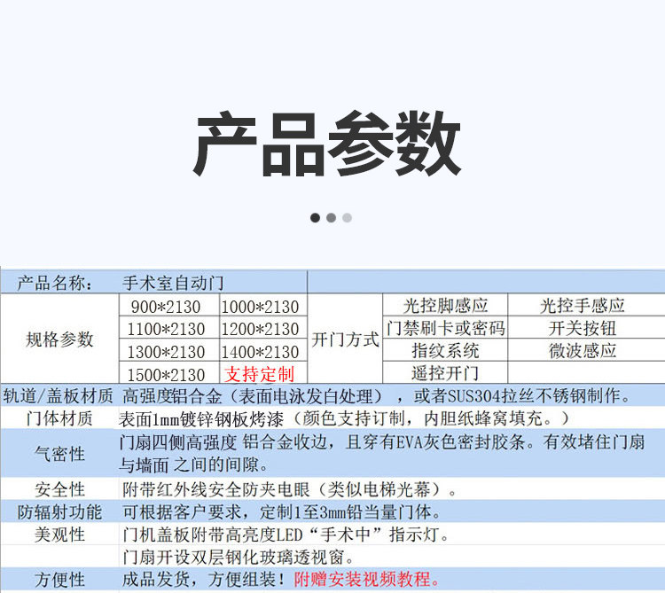 價格為全套價格:含門體,導(dǎo)軌,罩蓋,電機,電壓器,腳感應(yīng),安全光線,手術(shù)中燈等。 整體保修一年