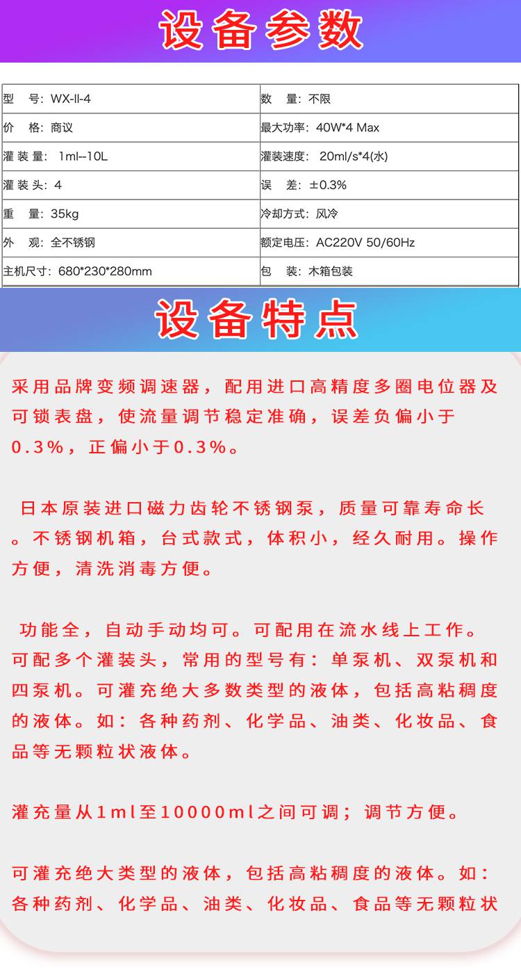 | 功率:1.6kw | 外形尺寸:680*230*280 | 灌裝頭數(shù):4 |