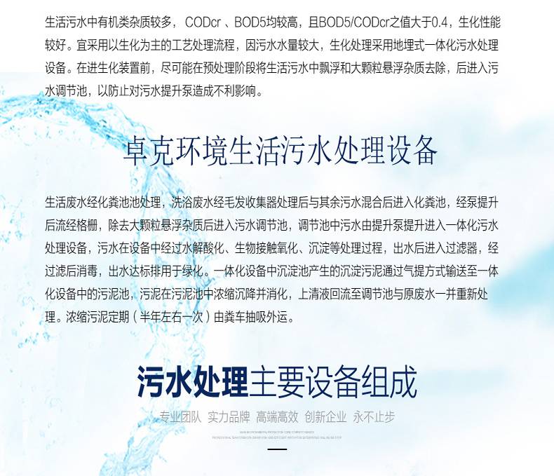 卓克水處理設(shè)備公司生產(chǎn)的小區(qū)生活污水處理設(shè)備主要用于居住小區(qū)(含別墅小區(qū))、高級賓館、醫(yī)院、綜合辦公樓和各類公共建筑的生活污水處理,經(jīng)該設(shè)備處理的出水水質(zhì),達(dá)到國家排放標(biāo)準(zhǔn)。