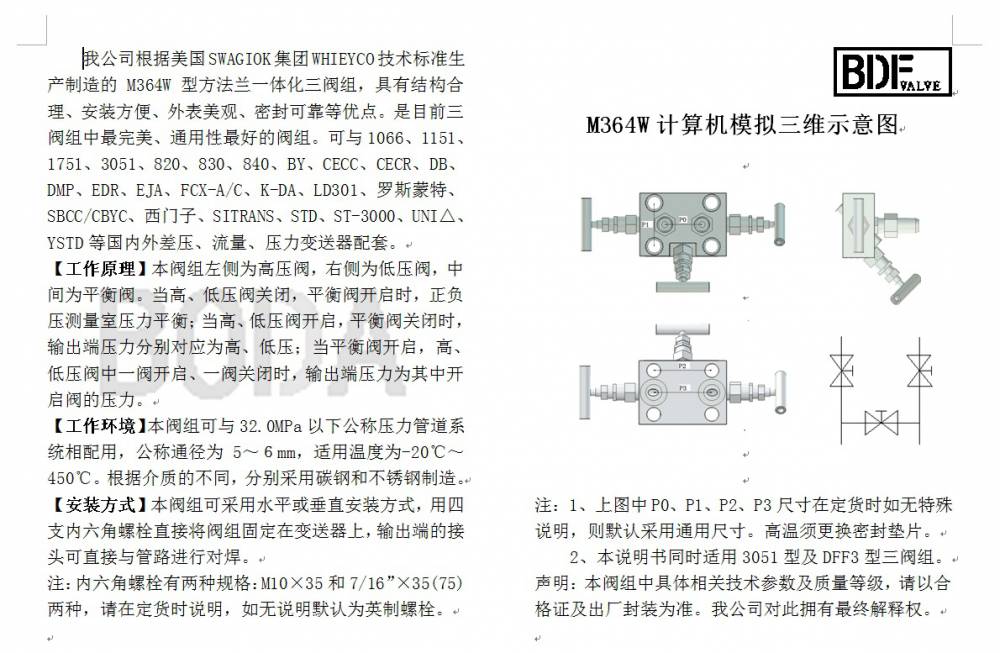 我公司根據(jù)美國SWAGIOK集團(tuán)WHIEYCO技術(shù)標(biāo)準(zhǔn)生產(chǎn)制造的M364W型方法蘭一體化三閥組,具有結(jié)構(gòu)合理、安裝方便、外表美觀、密封可靠等優(yōu)點。是目***閥組中******、通用性的閥組。可與1066、1151、1751、3051、820、830、840、BY、CECC、CECR、DB、DMP、EDR、EJA、FCX-A/C、K-DA、LD301、羅斯蒙特、SBCC/CBYC、西門子、SITRANS、STD、ST-3000、UNI△、YSTD等國內(nèi)外差壓、流量、壓力變送器配套。