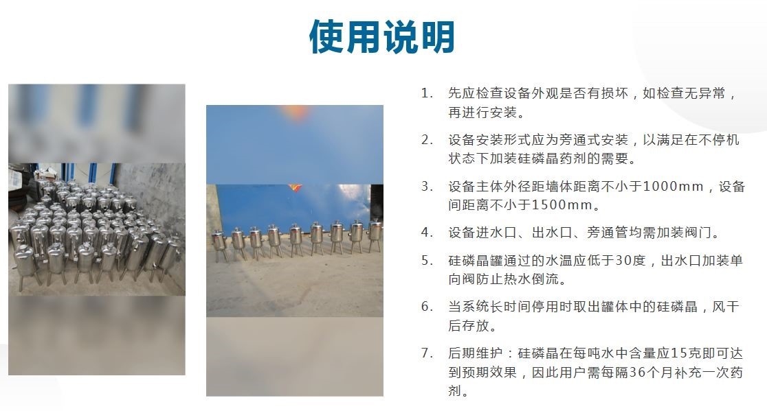 硅磷晶在每噸水中含量應(yīng)1~5克即可達(dá)到預(yù)期,因此用戶需每隔3~6個(gè)月補(bǔ)充一次藥劑。