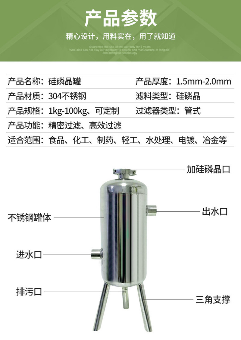硅磷晶罐由接管、筒體、進(jìn)出濾網(wǎng)、法蘭、法蘭蓋及緊固件等組成。防止硅磷晶由罐體內(nèi)流向管道中。確保加熱社備、泵等、能正常工作和運(yùn)轉(zhuǎn)。