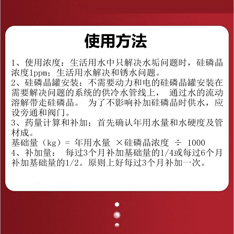 2、硅磷晶罐通過的水溫應低于30度,出水口加裝單向閥防止熱水倒流。當系統(tǒng)長時間停用時取出罐體中的硅磷晶,風干后存放。