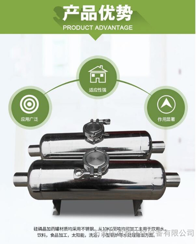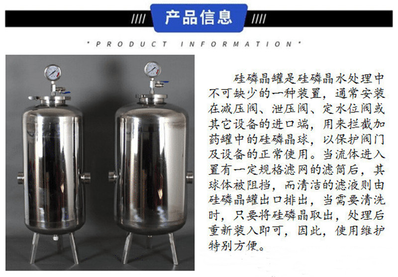 4、硅磷晶罐材質: 對于不同的服役條件可考慮選擇塑料,玻璃鋼,碳鋼、或不銹鋼材質的硅磷晶罐。