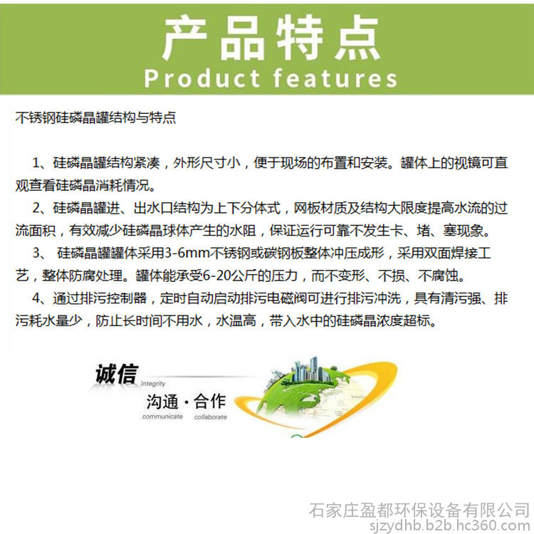 1、結(jié)構(gòu)緊湊,外形尺寸小,便于現(xiàn)場(chǎng)的布置和安裝。罐體上的視鏡可直觀查看硅磷晶消耗情況。