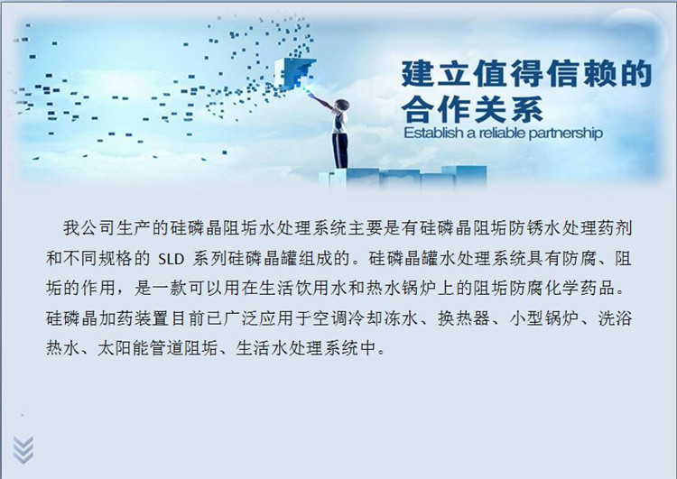 硅磷晶阻垢設(shè)備集防腐、防垢、凈化于一體化的完善設(shè)計(jì),其內(nèi)部前置核心部分在水流經(jīng)通腔時(shí),即與水中的陽離子(鈣、鎂)發(fā)生絡(luò)合反應(yīng),釋放出起擾亂作用的介質(zhì),抑制其晶核的形成,使設(shè)備出水再經(jīng)加熱無水垢生成。同時(shí),出水流經(jīng)的設(shè)備、管路內(nèi)壁會(huì)自動(dòng)生成能自修防腐保護(hù)膜,這樣終端出水潔凈,無‘銹水、結(jié)垢’發(fā)生,飲用水中不再含有對(duì)人身體健康有危害的重金屬離子,抑制了因輸送和使用中金屬的腐蝕而造成的“水二次污染”。YD型后置凈化過濾設(shè)計(jì),更適合于原水懸浮物雜質(zhì)高的水質(zhì),反沖洗過濾功能在系統(tǒng)運(yùn)行時(shí)及時(shí)進(jìn)行清洗并排污,省去了傳統(tǒng)過濾器清洗時(shí)拆換濾芯的繁雜程序,作簡便可靠、運(yùn)行穩(wěn)定。