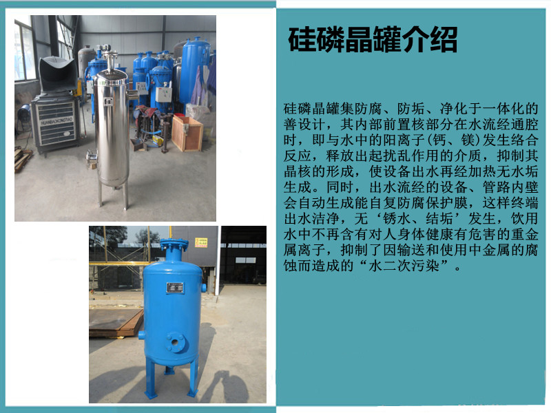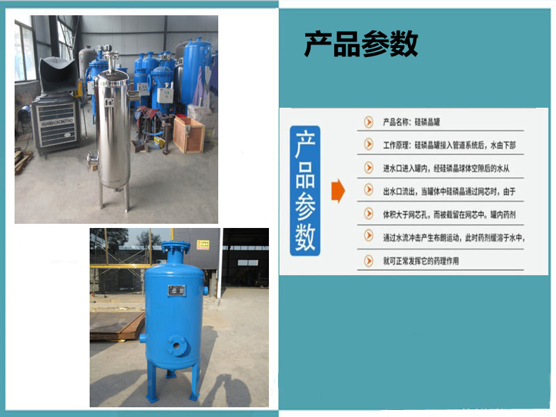 1、硅磷晶罐應(yīng)該安裝在設(shè)備的主進(jìn)水管道或者管道上。