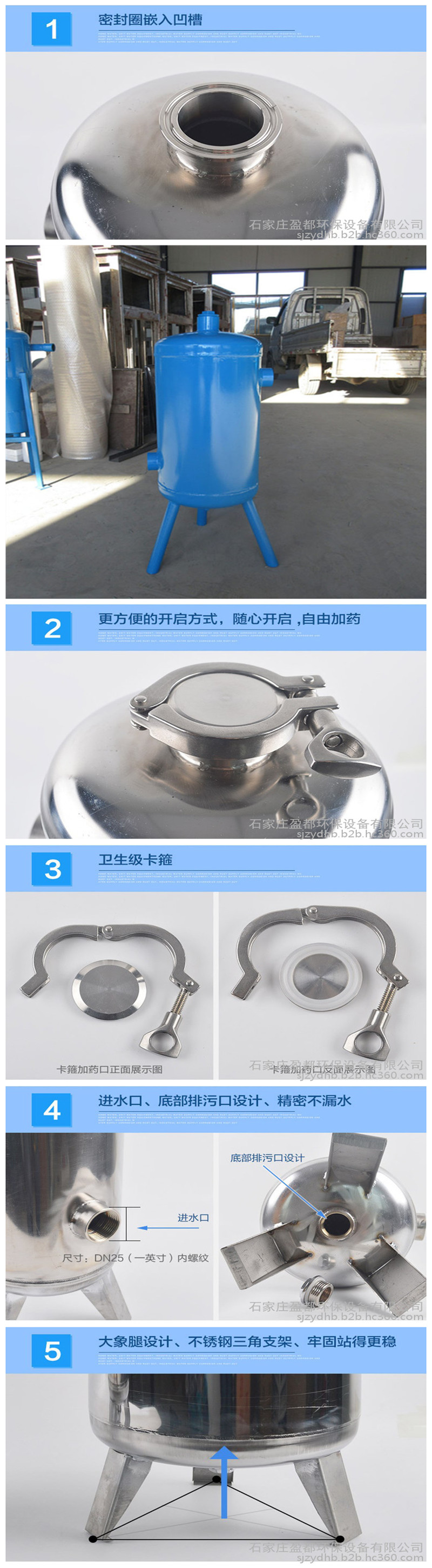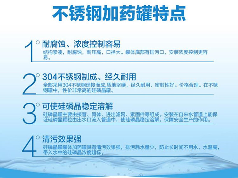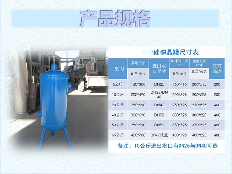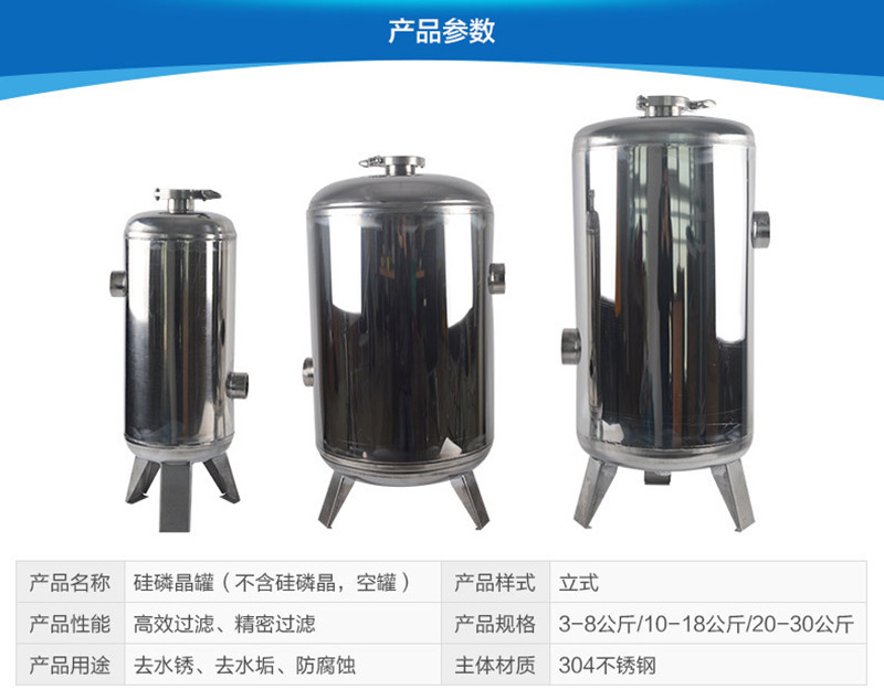 我公司硅磷晶罐為304不銹鋼制作,美觀大方,堅固耐用。日處理水量從10噸到200噸不等,添加硅磷晶從10KG到200KG不等。