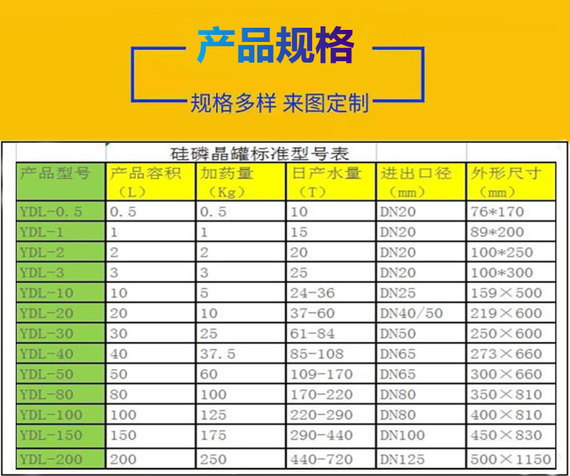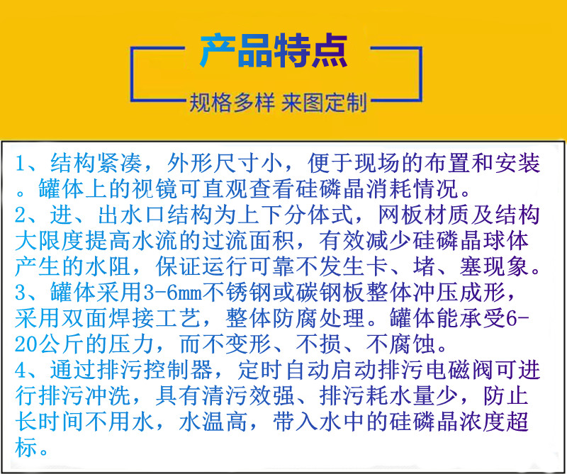 我廠根據(jù)用戶處理水量不同可以定做不同型號(hào)不同材質(zhì)(不銹鋼、碳鋼)的硅磷晶罐、硅磷晶容器。我公司硅磷晶為廠家直銷,省去中間商的費(fèi)用,質(zhì)優(yōu)價(jià)廉。且采用韓國技術(shù)生產(chǎn),種類齊全,均符合FAO/WHO的標(biāo)準(zhǔn),質(zhì)量有保障。sldgle