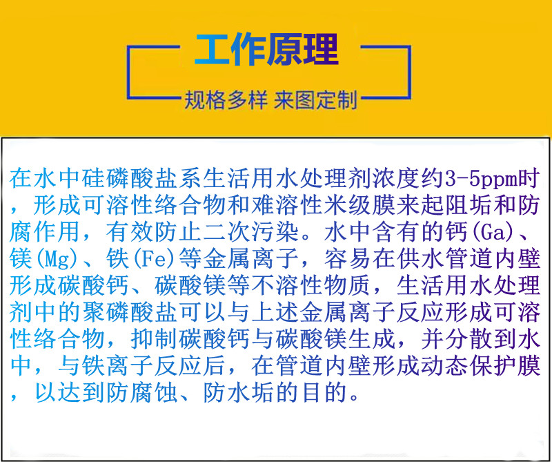 硅磷晶:一種經(jīng)濟(jì)有效的防止設(shè)備及管道結(jié)垢和腐蝕的新一代水處理藥劑,是以獨(dú)特的配方和工藝制成的難溶于水的玻璃質(zhì)緩釋小球,是聚磷酸鹽/ 聚硅酸鹽組成的微溶性聚合體。產(chǎn)品又稱為“潔靈精”、“歸麗晶”、“硅磷晶”。在水中聚磷酸鹽能防止晶體生長和凝聚,并對(duì)鐵離子起封閉作用,對(duì)氫氧化鐵起分散作用。聚磷酸鹽和硅酸鹽更能使管道內(nèi)表面形成保護(hù)膜,防止金屬腐蝕,所以硅磷晶既緩蝕又阻垢,還有消銹垢本領(lǐng),堪稱“紅水”、“黃水”和堵塞的克星。