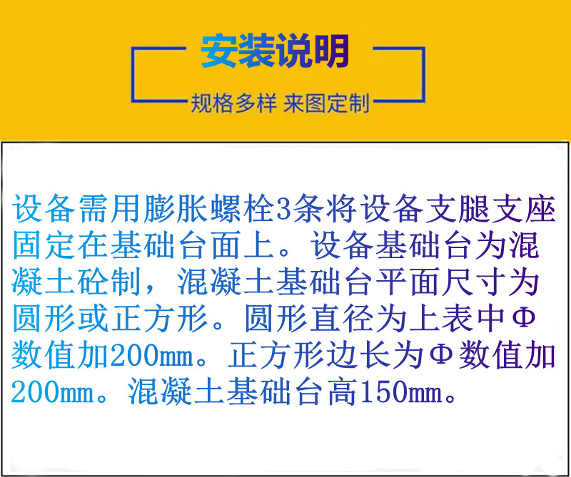 設(shè)備需用膨脹螺栓3條將設(shè)備支腿支座固定在基礎(chǔ)臺(tái)面上。設(shè)備基礎(chǔ)臺(tái)為混凝土砼制,混凝土基礎(chǔ)臺(tái)平面尺寸為圓形或正方形。圓形直徑為上表中Φ數(shù)值加200mm。正方形邊長為Φ數(shù)值加200mm。混凝土基礎(chǔ)臺(tái)高150mm。