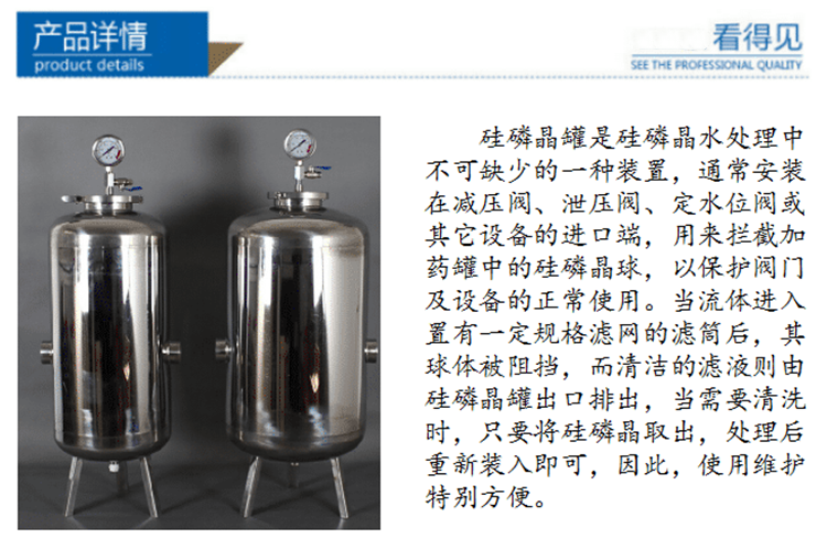 1、硅磷晶罐應該安裝在設備的主進水管道或者補水管道上。