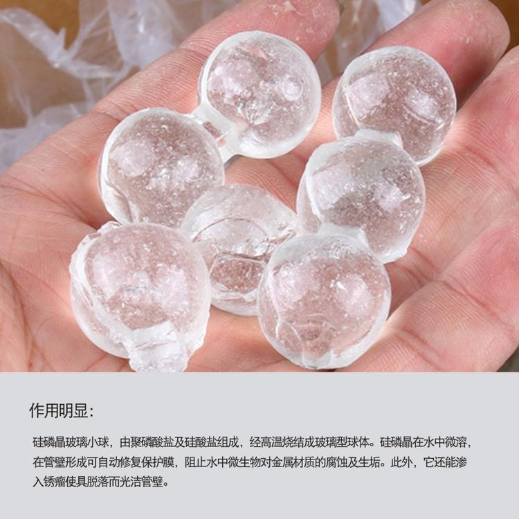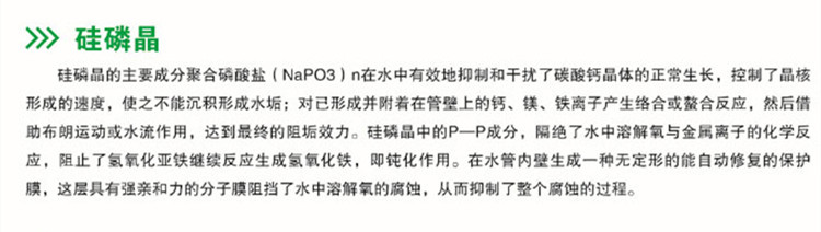 硅磷晶是對(duì)人體無(wú)害的聚合磷酸鹽。只須在給水管中溶入3~5ppm的P0WER-PHOS就可以在水管內(nèi)形成保護(hù)膜。防止水中含有的鈣、鎂、鐵等金屬離子形成不溶性鹽附著在水管內(nèi)壁發(fā)生腐蝕或生成水垢,而且還可以將已形成的不溶性鹽轉(zhuǎn)換為可溶性鹽,防銹性能極其卓。所謂水垢,是帶有陽(yáng)離子(+)的物質(zhì)接近于帶有陰離子(--)的管壁時(shí),在電荷引力作用下(正負(fù)荷相吸)相互結(jié)合而成。即通過離子結(jié)合在管壁上形成濃厚的結(jié)晶體。