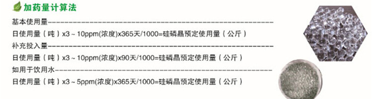 補(bǔ)充投入量:日使用量(噸)x5~10ppm(濃度)x90天/1000=P0WER-PHOS預(yù)定使用量(公斤)如用于飲用水:3-~5ppm(濃度)x356天/1000=P0WER-PHOS預(yù)定使用量(公斤)sldgle