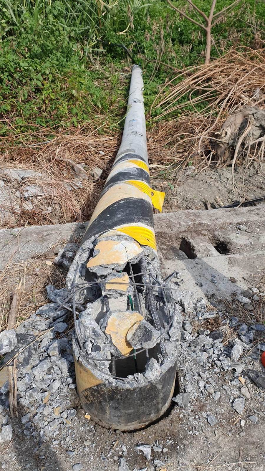 被吊車應(yīng)聲拖拉扯斷的路旁電線桿,從基座處斷裂,一根橫倒在馬路中央、另外一根往路旁草叢中倒下,所幸并未波及、傷及行人。(民眾提供/謝瓊云彰化傳真)