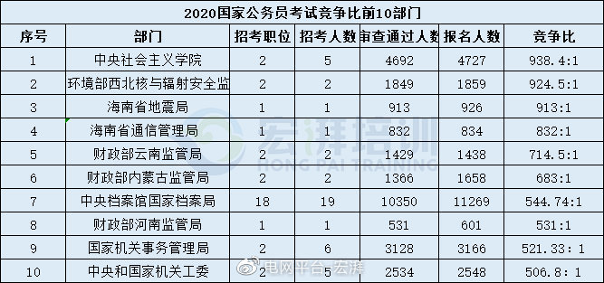 上圖為2020國(guó)家公務(wù)員考試競(jìng)爭(zhēng)比前10的部門(mén),主要看最后競(jìng)爭(zhēng)比一欄,基本都是幾百甚至上千人中錄取一人,如此激烈的競(jìng)爭(zhēng),國(guó)網(wǎng)還是比不來(lái)的。