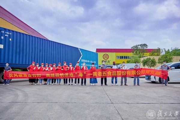 5月2日下午,懸掛著“長(zhǎng)風(fēng)破浪會(huì)有時(shí) 直掛云帆濟(jì)滄‘?!S老五食品股份有限公司黨支部”紅色橫幅的貨車,抵達(dá)復(fù)旦大學(xué)邯鄲校區(qū)。