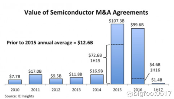 據(jù)市場調(diào)研機(jī)構(gòu)IC Insights數(shù)據(jù),過去兩年橫掃全球,創(chuàng)歷史記錄的半導(dǎo)體行業(yè)并購洪峰已過,2017年上半年已經(jīng)宣布的十幾起并購案,總金額不過14億美元,如今滔天洪水已化作涓涓細(xì)流。