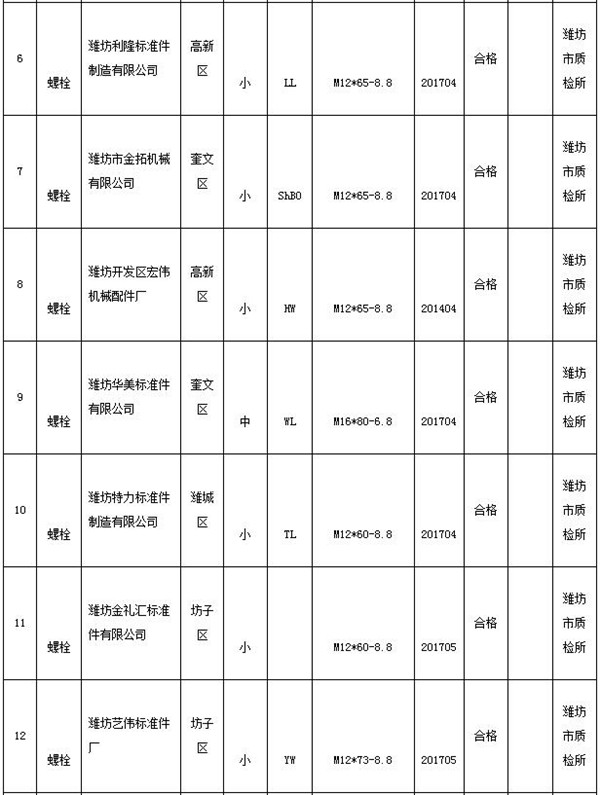 8月10日,山東濰坊市質(zhì)量技術監(jiān)督局官網(wǎng)公布2017年第2批緊固件-螺栓產(chǎn)品質(zhì)量市級監(jiān)督抽查結果,5批次產(chǎn)品不符合相關標準的要求。