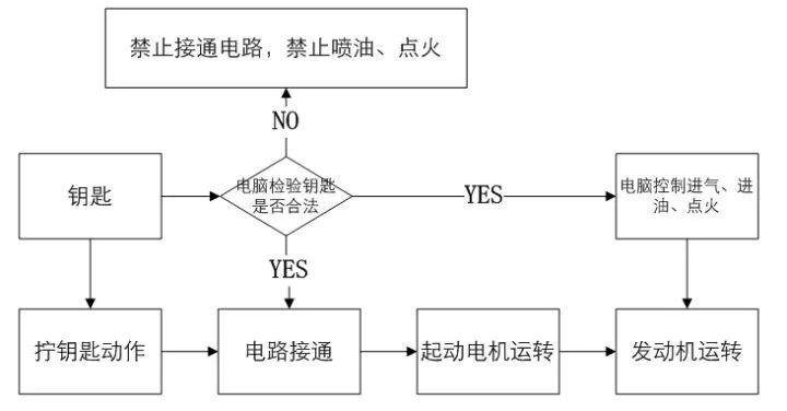 雖然從鑰匙時代開始到現(xiàn)在,汽車啟動都是把鑰匙輕輕一擰,但其實這里面的過程早就不一樣了。并且隨著汽車技術(shù)的發(fā)展和汽車的電子防盜系統(tǒng)(immobilizer,簡稱immo)越來越強大,特工們的生活也變得越來越不好過了。從起先的搖把啟動的無防盜到鑰匙啟動的物理防盜,再到具備電子防盜功能的鑰匙,直到現(xiàn)在無鑰匙啟動?,F(xiàn)在汽車配備了immo之后,從擰鑰匙到汽車啟動的過程變成了下面這張圖: