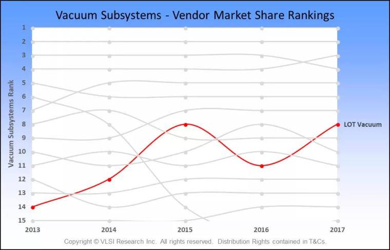 為了爭取這一市場,韓國和中國都在積極推動真空配件市場的本地化供應(yīng)。例如韓國真空泵供應(yīng)商LOT Vacuum,最近一直在大踏步前進(jìn),并且從2013年的排名第14位上升到第8位。2016年有所下滑,隨后在去年又取得1.5%的市場份額而重新回到第8位。然而,歐洲和日本廠商對該技術(shù)的充分掌控可能意味著在短時間內(nèi),不太可能看到市場格局有較大變化。