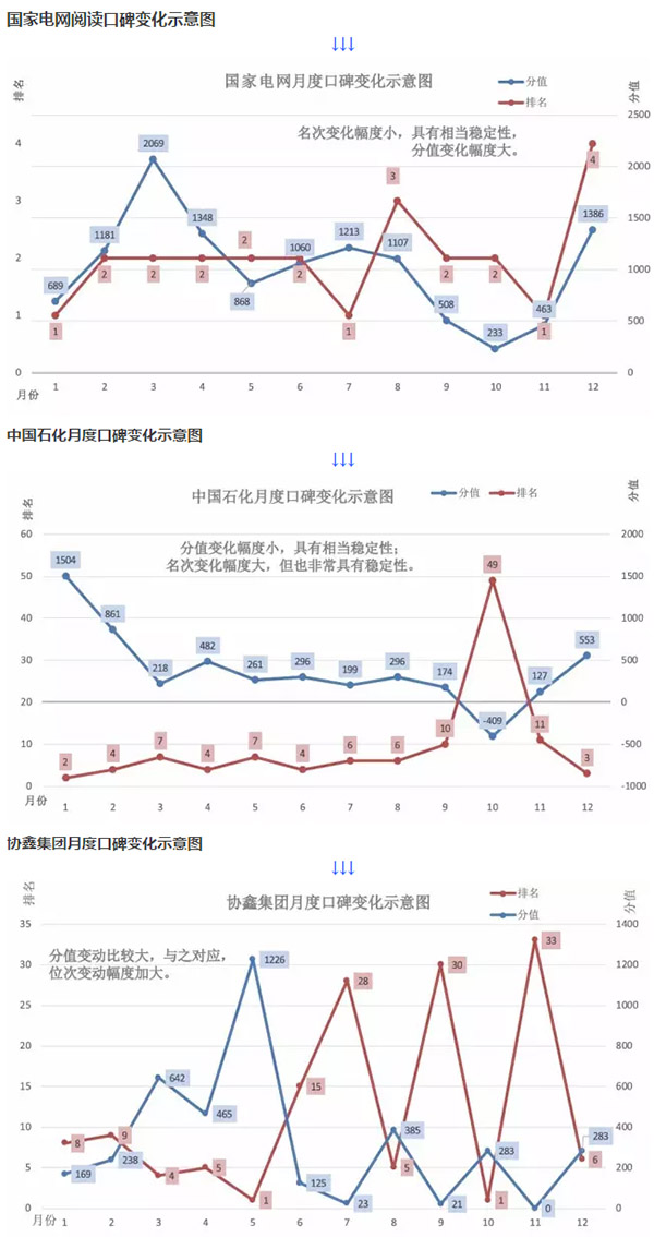 以上的觀察,都是從宏觀入眼。從微觀角度而言,為數(shù)不少的企業(yè),一年12個(gè)月中,每家企業(yè)的口碑波動(dòng)都比較大。以在總榜單位居“探花”的中國(guó)石化為例,2016年1月,曾以+1504的分值排名第二;10月,則以-409的分值位列第四十九位,兩者絕對(duì)分值差為1913,位次差47,變動(dòng)幅度巨大。這種情況,在中國(guó)石油等企業(yè)身上也同樣出現(xiàn)過(guò)。不僅國(guó)有企業(yè)如此,民營(yíng)企業(yè)也如此:新能源企業(yè)協(xié)鑫,最高分值+1226,最低分值0,絕對(duì)差值也很大。