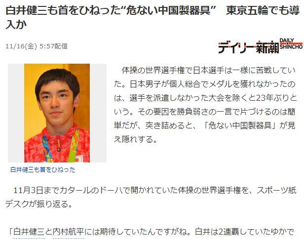 今年11月1日在體操世錦賽男子全能比賽中,日本的萱和磨、白井健三分別只獲得第6、第7。這是日本隊時隔23年無緣世錦賽男子個人全能獎牌。白井健三賽后就再次抱怨說:“最初就覺得很不對勁,像在草地上的感覺,簡直是冒著生命危險的比賽器械。”當(dāng)時白井健三的女友村上茉愛也公開表示:“和去年比賽的法國品牌相比,硬了很多,彈力太差了?!?/p>
