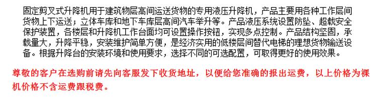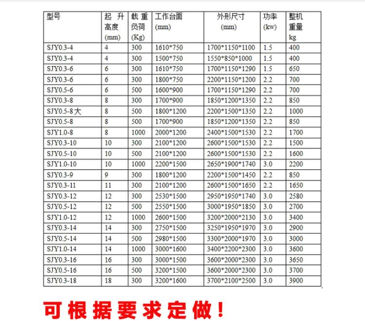 由于受建筑物或工作擱層的高度,所載物體的大小、重量及其它使用要求的影響,其型號有很多不確定因素。當(dāng)列表所示型號不適合使用要求時(shí),可根據(jù)實(shí)際使用環(huán)境和操作要求,對升降臺的升高、承載量、平臺面積等進(jìn)行組合,以便取得理想的使用
