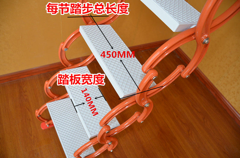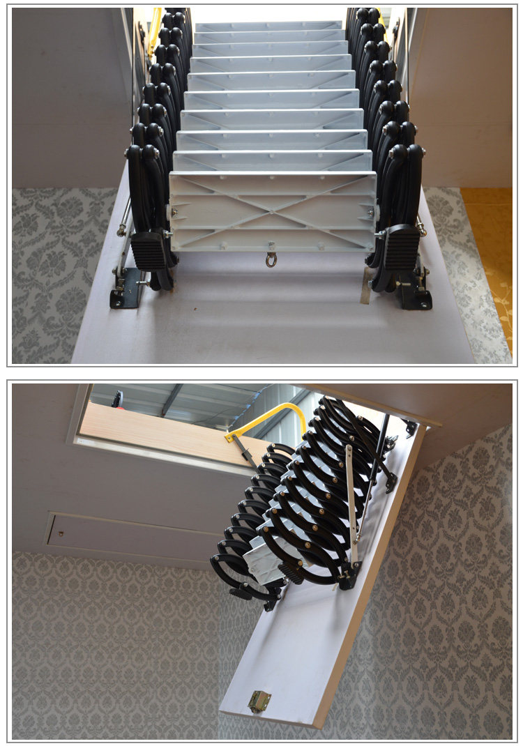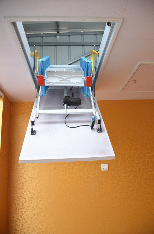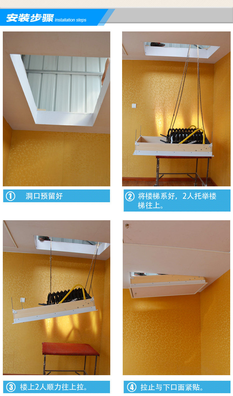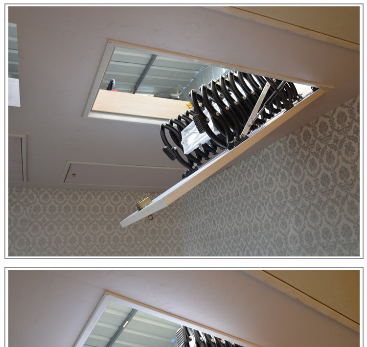 2.你們的樓梯如何安裝?對樓孔有什么要求 答:本樓梯最為吸引人處的就是其空間壓縮性。只需要固定樓梯的四個角上的M8螺母與壓板,安裝即可完成,為您大大節(jié)省了定制安裝樓梯的麻煩與時間,您所需要做的只是預留一個樓孔目前有三種可選(700*900/700*1000/700*1200),已做好孔的也可根據(jù)需要進行調(diào)整。 3.你們的樓梯承重如何?部件可靠嗎? 答:本樓梯總承重達300kg,絕對滿足需求,材料均使用優(yōu)質(zhì)鎂合金,經(jīng)久耐用。 4.你們的樓梯都有哪幾種?有什么區(qū)別? 答:現(xiàn)在我公司推出伸拉樓梯,手動型,電動型滿足各類要求。電動型采用進口電機,無線遙控器,實現(xiàn)自動的折疊與收攏。 5.你們的樓梯對樓高有什么要求嗎?