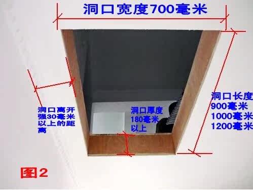 如果洞口是后開的,則建議使用中或大的規(guī)格(如700*1000或700*1200),這樣不管是走人還是拿東西都會比較方便。預留洞口標準(如圖2)。對角線尺寸要一致,洞口小于標準尺寸或傾斜會導致安裝麻煩。