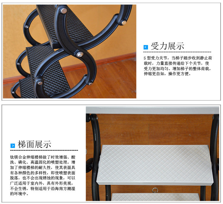特別提醒:樓梯是大件物品,提貨時候 一定要求開箱驗貨!避免不必要的損失!如有損壞請拒簽,及時聯(lián)系客服! 鈦鎂合金樓梯細節(jié):