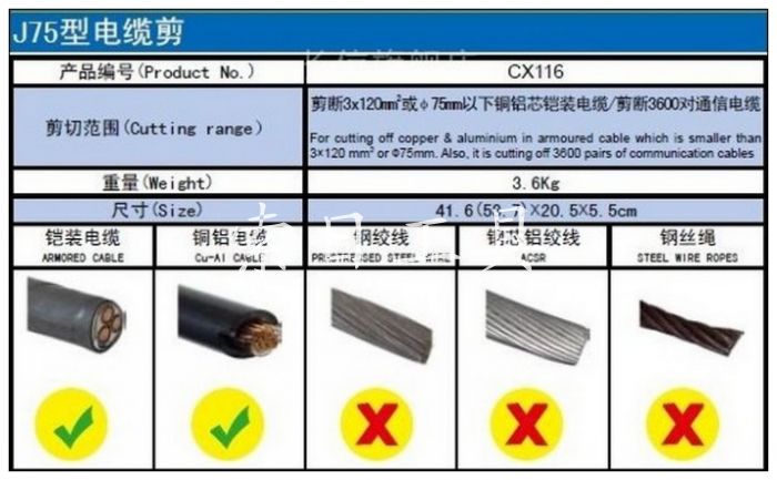 使用范圍:剪斷3×120mm2及直徑75mm以下銅鋁芯鎧裝電纜,剪斷3600對通信電纜