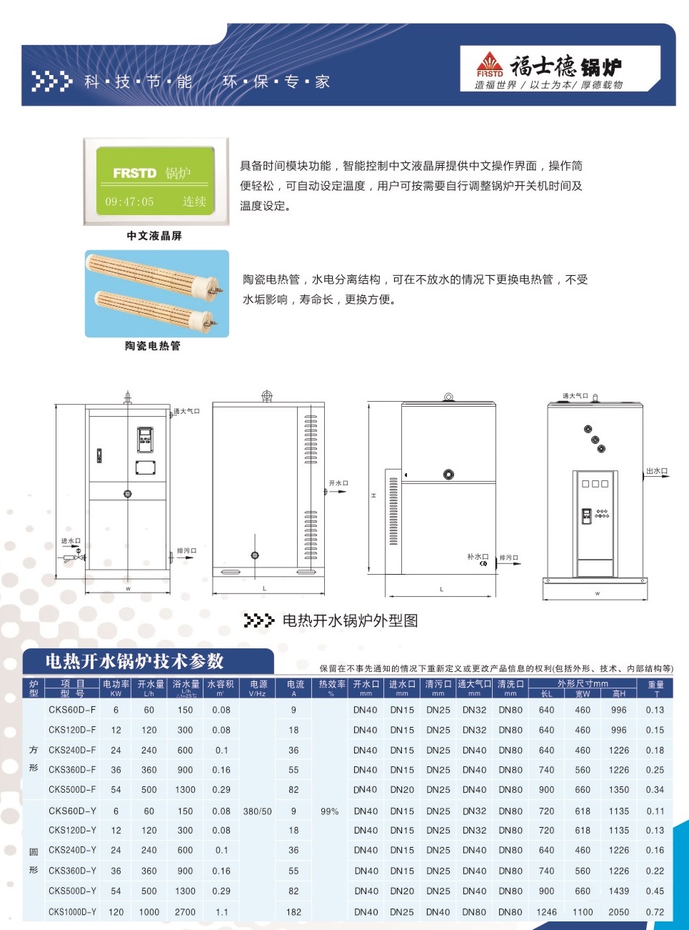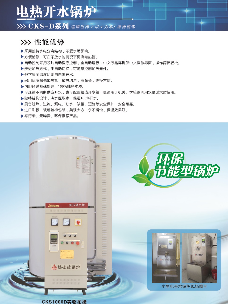 無(wú)污染、無(wú)噪音、綠色環(huán)保推薦產(chǎn)品。 鍋爐采用專(zhuān)利設(shè)計(jì)的微電腦控制器,智能控制,全自動(dòng)運(yùn)行,操作簡(jiǎn)便輕松,中文液晶屏圖文動(dòng)畫(huà)界面顯示,鍋爐工作狀態(tài)一目了然,水溫變化數(shù)字顯示,明明白白喝開(kāi)水。 水位感應(yīng)裝置,智能補(bǔ)水裝置和加熱裝置的相互協(xié)調(diào)工作,使鍋爐自動(dòng)補(bǔ)水及供應(yīng)開(kāi)水功能十分合理,獨(dú)特結(jié)果設(shè)計(jì),沸水區(qū)取水,保證100%開(kāi)水,把“出水百分之百是開(kāi)水,不是開(kāi)水不出水”的概念變成現(xiàn)實(shí),杜絕出現(xiàn)“千沸水”、“陰陽(yáng)水”的現(xiàn)象,保證了健康飲水。 加熱裝置運(yùn)用陶瓷電加熱管,獨(dú)特水電分離結(jié)構(gòu),耐壓強(qiáng)度高,不受水垢影響,方便檢修,可在不放水的情況下更換電熱管。 采用步進(jìn)加熱方式,減少對(duì)電網(wǎng)的沖擊,安全用電系數(shù)提高。 全面系統(tǒng)的溫度顯示、過(guò)熱保護(hù)、溫度控制、超溫保護(hù)、漏電保護(hù)、過(guò)流保護(hù)、缺水保護(hù)、缺相保護(hù)、短路保護(hù)、故障聲光報(bào)警等智能控制功能,保證鍋爐在正常運(yùn)行中工作,遠(yuǎn)離安全隱患。 內(nèi)膽經(jīng)過(guò)特殊處理,100%純凈水質(zhì),確保水質(zhì)清潔、衛(wèi)生。 可連續(xù)不間斷供應(yīng)開(kāi)水,也可配置蓄熱開(kāi)水箱,更適用于機(jī)關(guān)、學(xué)校瞬間用水量過(guò)大時(shí)使用。 外殼采用不銹鋼箱體,特殊材料保溫,美觀大方,永不銹蝕,保溫效果理想。 開(kāi)水鍋爐具有開(kāi)水、熱水兩種功能,設(shè)置為開(kāi)水狀態(tài)時(shí),即能直接不間斷供應(yīng)開(kāi)水,又能與專(zhuān)用保溫開(kāi)水箱相連,滿足學(xué)校、醫(yī)院等企事業(yè)單位大量用水的需求。同時(shí)進(jìn)水、補(bǔ)水也為全自動(dòng)模式,設(shè)置為熱水狀態(tài)時(shí),水溫達(dá)到設(shè)定溫度后,鍋爐自動(dòng)把所需溫度的熱水推入保溫水箱,以備洗浴使用。