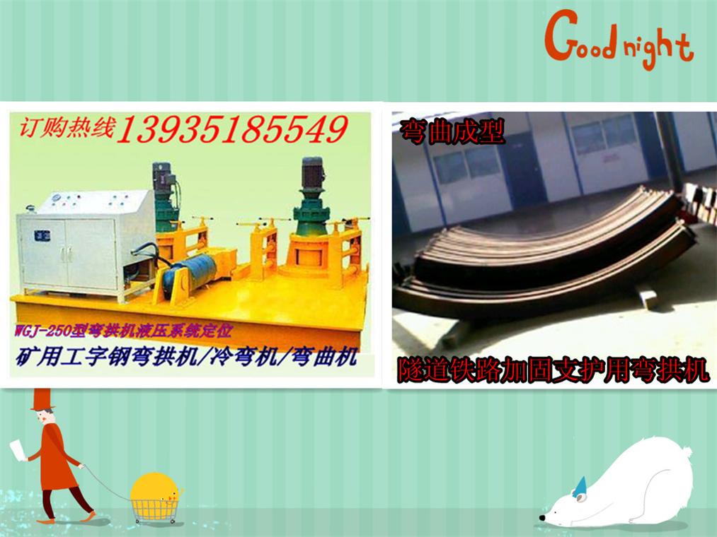 WGJ-250工字鋼彎曲機(jī)(冷彎拱機(jī))是我廠研發(fā)的新型全自動彎曲型鋼產(chǎn)品。采用液壓系統(tǒng),具有傳動平穩(wěn),壓力大等特點(diǎn),主要應(yīng)用于隧道,地鐵,水電站,地下洞室等工字鋼,槽鋼彎曲。