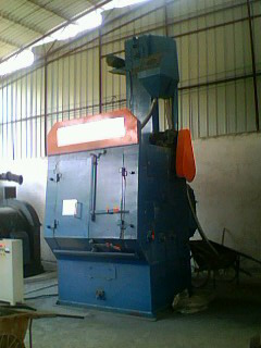 在拋丸機(jī)清理室中加入不超過規(guī)定重量的工件,機(jī)器啟動(dòng)后,工件被履帶帶動(dòng),開始翻轉(zhuǎn),同時(shí)拋丸器高速拋出的彈丸形成丸束,均勻地打擊在工件表面上,從而達(dá)到清理的目的。拋出的彈丸及砂粒經(jīng)橡膠履帶上的小孔,流入底部的鋼板網(wǎng)過篩,經(jīng)螺旋輸送器送入提升機(jī)內(nèi),由斗式提升機(jī)提升到分離器中進(jìn)行分離。粉塵由風(fēng)機(jī)吸送到除塵器中過濾,布袋上的灰塵經(jīng)機(jī)械振打落入除塵器底部的集塵箱中,用戶可定期清除,廢砂由廢料管流出,用戶可回用。丸砂混合物由回用管收回進(jìn)入室體,待分離器分離后再回用,干凈的彈丸經(jīng)由供丸系統(tǒng)的電磁供丸閘門進(jìn)入拋丸器再次拋打工件。工件清理完畢后,履帶反轉(zhuǎn)將工件卸出。