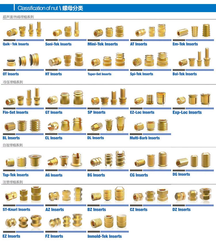 二、按安裝使用方式可分為:超聲波/熱熔螺母、注塑螺母、自攻螺母、冷壓螺母。