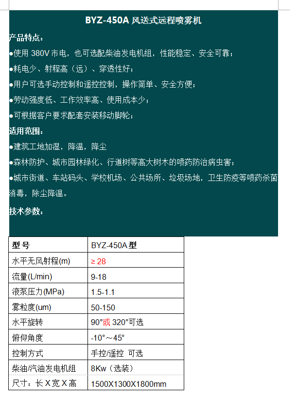 BYZ系列除塵噴霧機(jī)適用于環(huán)保行業(yè)、易起塵的煤炭及其他物料堆場(chǎng)、卸料口、車輛卸料時(shí)、碼頭、煉鋼廠等的噴水除塵、抑塵、降溫;公共場(chǎng)所或垃圾填埋場(chǎng)噴灑藥物等。