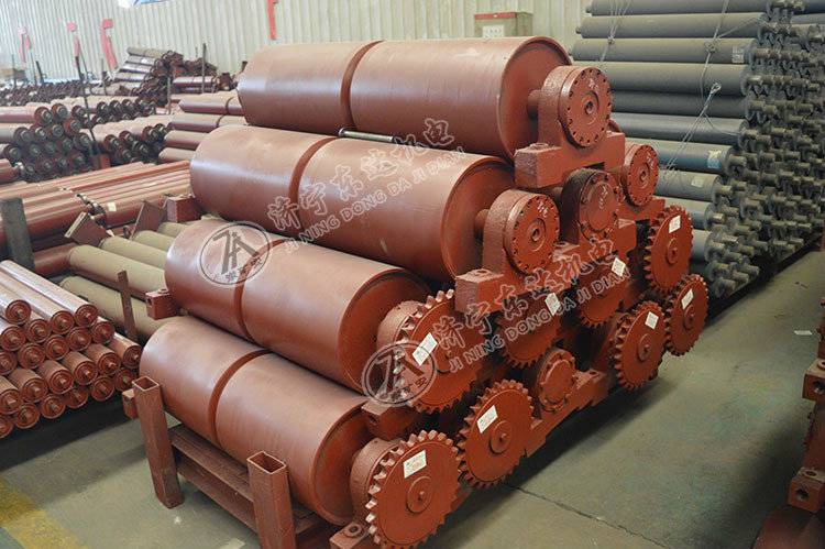 傳動滾筒組和承受輸送帶高張力的滾筒組,包括輸送機頭部和尾部的主傳動滾筒組,傳遞全張力的滾筒,卸料小車上的改向滾筒,尾部驅(qū)動時的終端頭部滾筒等。在輸送機返回運行的張力較低的改向滾筒,如終端尾部滾筒被制動,下行輸送機的終端頭部滾筒組一張緊裝置的改向滾筒組和彎向滾筒。