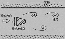 在流體中設(shè)置三角柱型旋渦發(fā)生體,則從旋渦發(fā)生體兩側(cè)交替地產(chǎn)生有規(guī)則的旋渦,這種旋渦稱為卡門旋渦,如右圖所示,旋渦列在旋渦發(fā)生體下游非對(duì)稱地排列。
