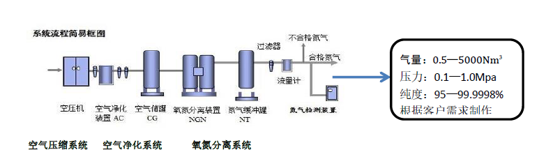 原料空氣經(jīng)壓縮機壓縮后進入后級空氣儲罐,大部分油、液態(tài)水、灰塵附著容器壁厚流到罐底,并定期從排污閥排出,一部分隨氣流進入到壓縮空氣凈化系統(tǒng)??諝鈨艋到y(tǒng)由冷干機及三支精度不同的過濾器及一支除油器組成,通過冷凍除濕以及過濾器由粗到精的,將壓縮空氣中的液態(tài)水,油及塵埃過濾干凈,使壓縮空氣壓力露點降到2~10℃,含油量降至0.001 PPm,塵埃過濾到0.01μm,保證了進入PSA制氮機原料氣的潔凈。凈化后的空氣,經(jīng)過兩路,分別進入兩個吸附塔,通過制氮機上氣動閥門的自動切換進行交替吸附于解吸,這個過程將空氣中的大部分氮與少部分氧進行分離,并將富氧空氣排出。氮氣在塔頂富集由管路輸送至后級氮氣儲罐,并經(jīng)流量計后進入用氣點。